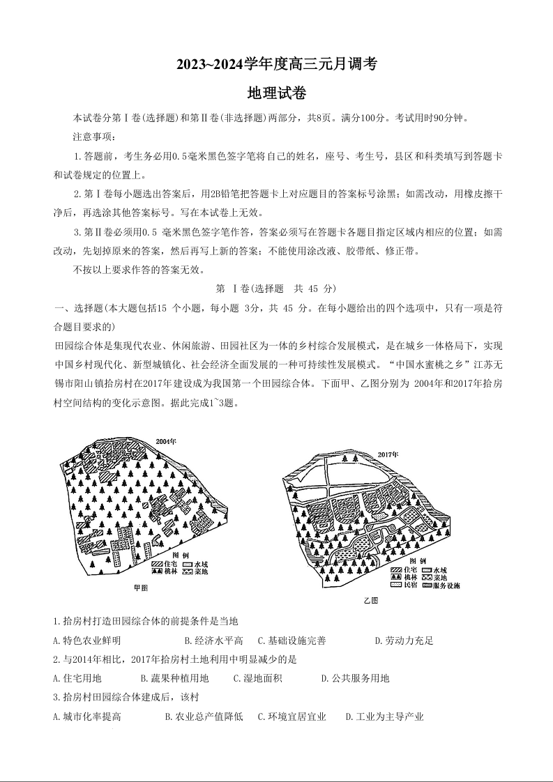 湖北省武汉市江岸区2023-2024学年高三上学期元月调考 地理