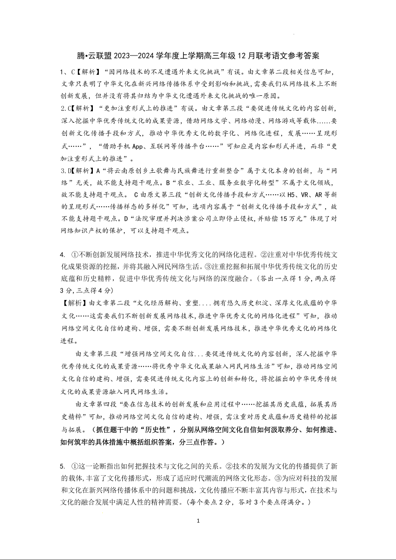 湖北省腾云联盟2023-2024学年高三上学期12月联考 语文答案