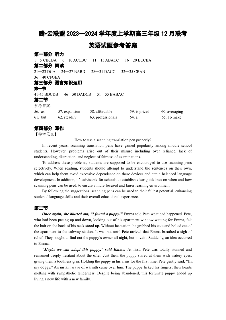 湖北省腾云联盟2023-2024学年高三上学期12月联考 英语答案