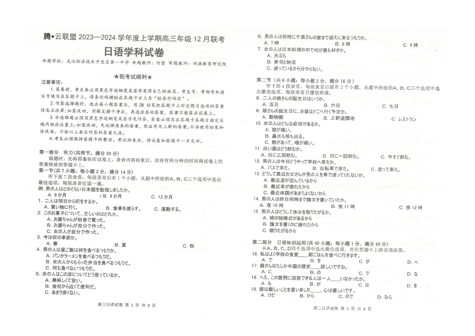湖北省腾云联盟2023-2024学年高三上学期12月联考 日语