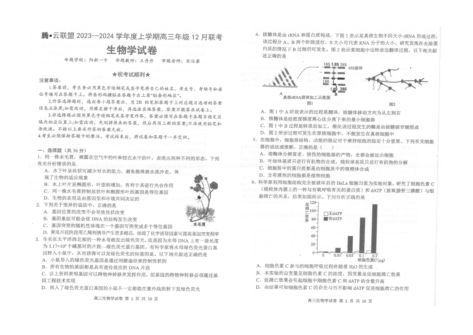 湖北省腾云联盟2023-2024学年高三上学期12月联考 生物