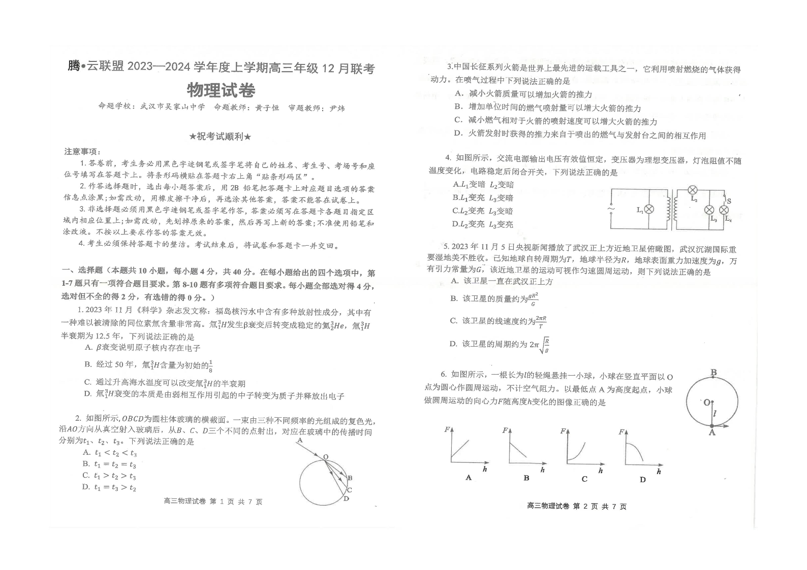 湖北省腾云联盟2023-2024学年高三上学期12月联考 物理