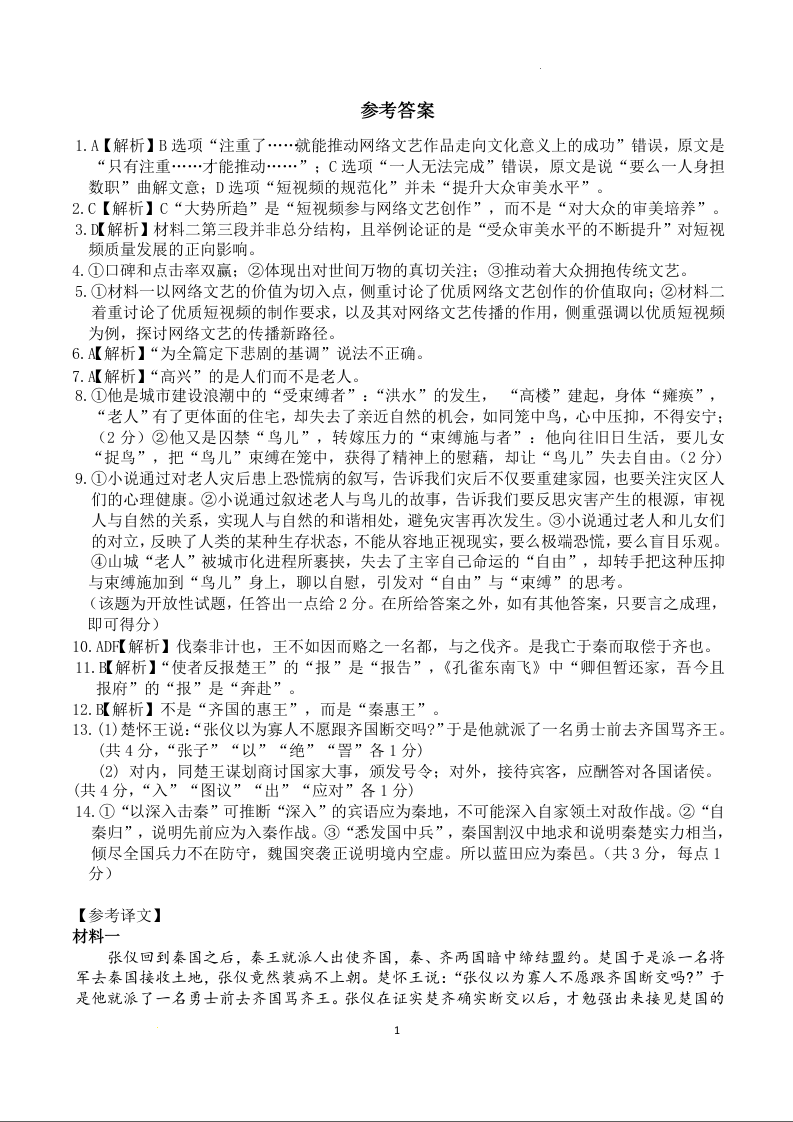 湖北省黄冈市部分普通高中2023-2024学年高三上学期期中考试 语文答案