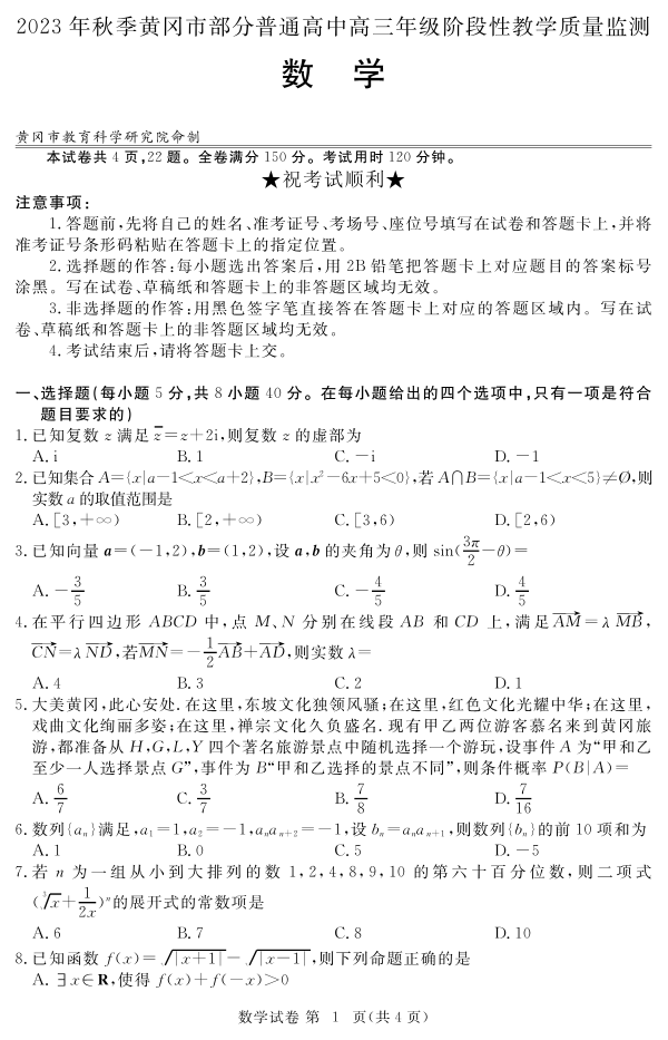 湖北省黄冈市部分普通高中2023-2024学年高三上学期期中考试 数学