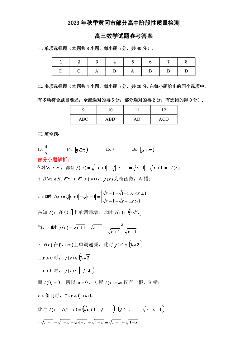 湖北省黄冈市部分普通高中2023-2024学年高三上学期期中考试 数学答案