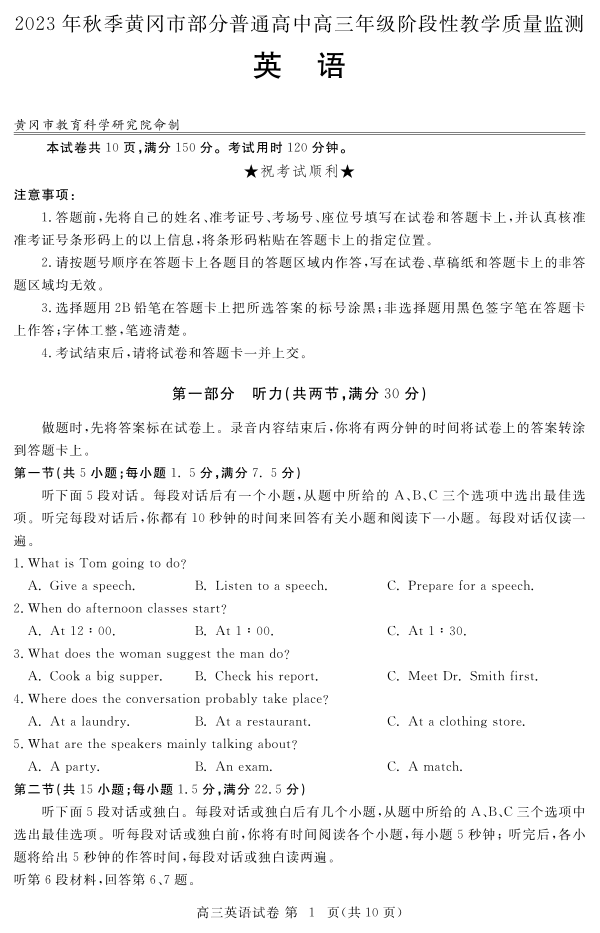 湖北省黄冈市部分普通高中2023-2024学年高三上学期期中考试 英语