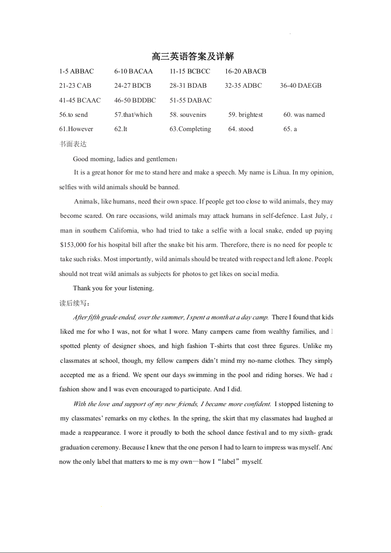 湖北省黄冈市部分普通高中2023-2024学年高三上学期期中考试 英语答案