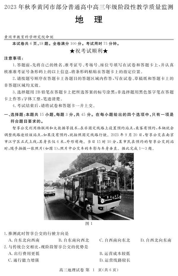 湖北省黄冈市部分普通高中2023-2024学年高三上学期期中考试 地理