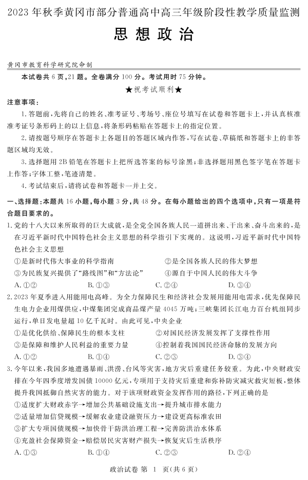 湖北省黄冈市部分普通高中2023-2024学年高三上学期期中考试 政治