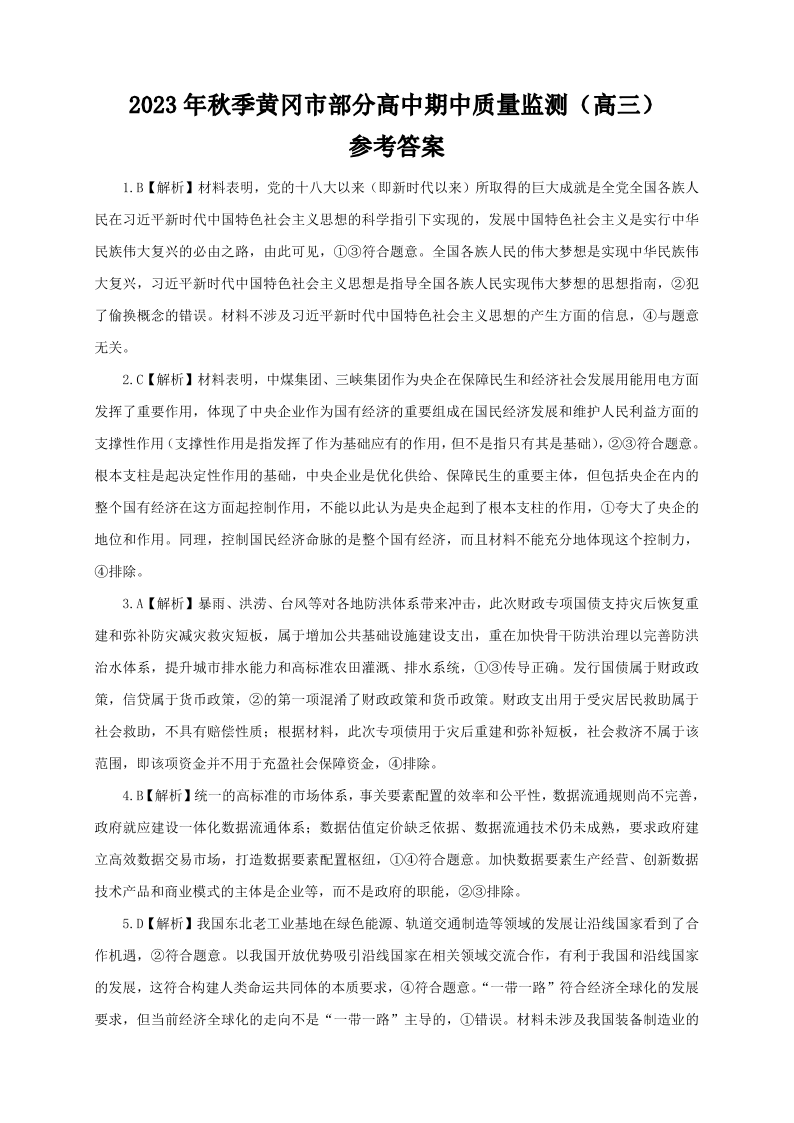 湖北省黄冈市部分普通高中2023-2024学年高三上学期期中考试 政治答案