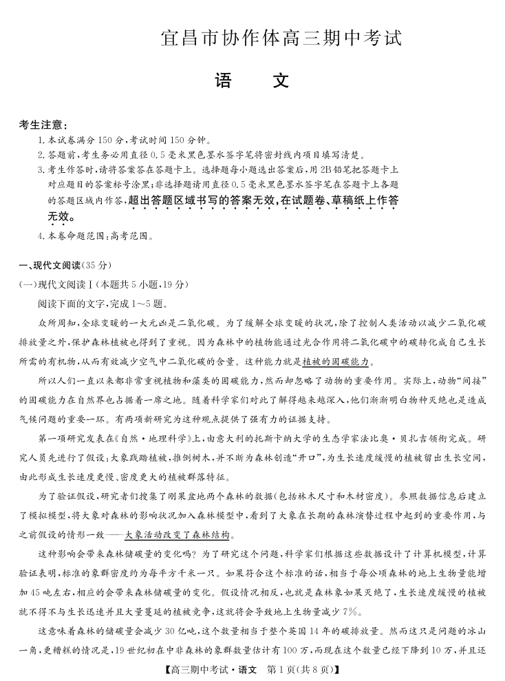 湖北省宜昌市协作体2023-2024学年高三上学期期中考试 语文