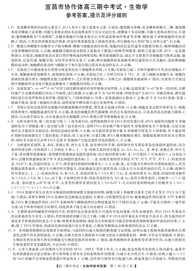 湖北省宜昌市协作体2023-2024学年高三上学期期中考试 生物答案