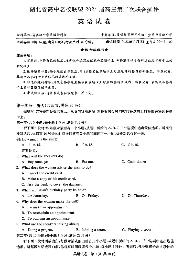 湖北省高中名校联盟2024届高三第二次联合测评 英语