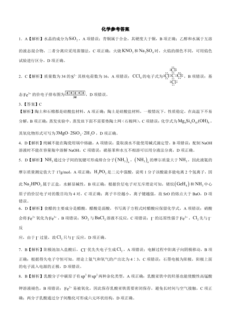 湖北省高中名校联盟2024届高三第二次联合测评 化学答案