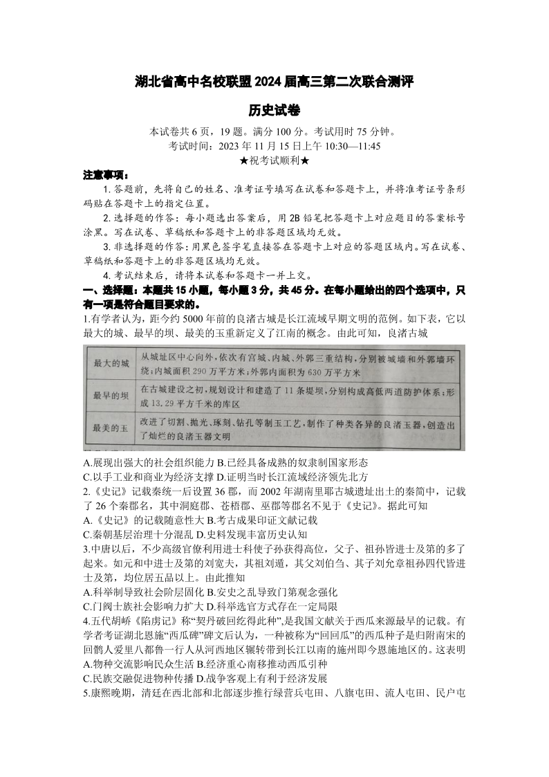 湖北省高中名校联盟2024届高三第二次联合测评 历史