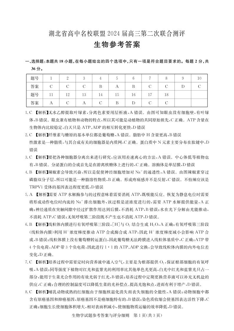 湖北省高中名校联盟2024届高三第二次联合测评 生物答案