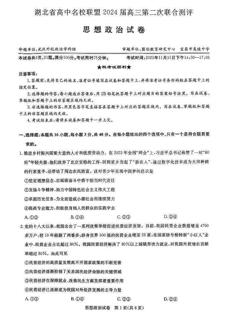 湖北省高中名校联盟2024届高三第二次联合测评 政治