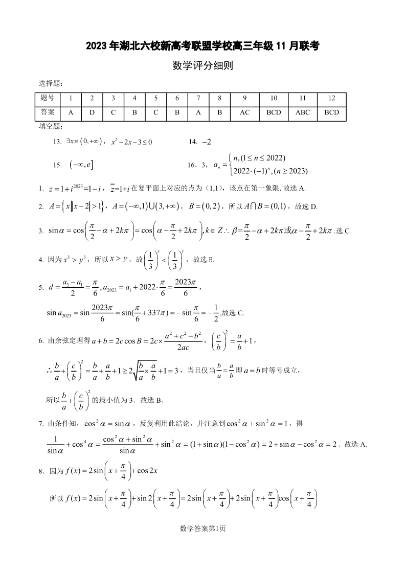 湖北省六校新高考联盟学校2023-2024学年高三上学期11月联考 数学答案