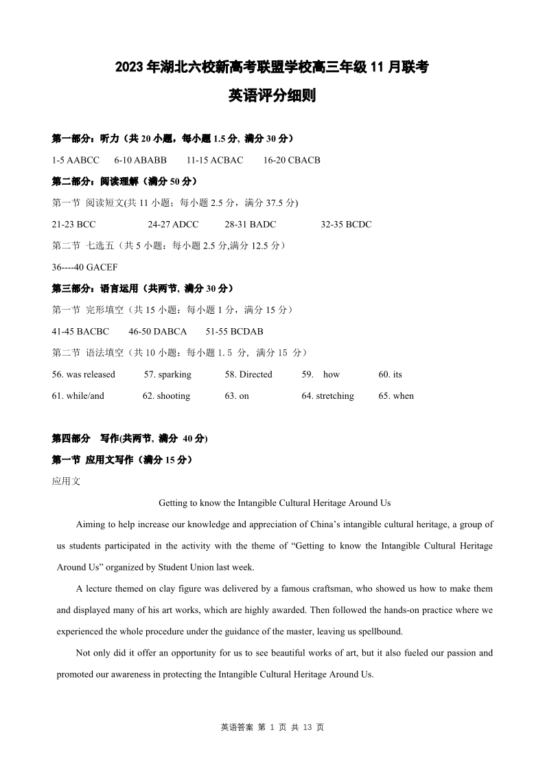 湖北省六校新高考联盟学校2023-2024学年高三上学期11月联考 英语答案