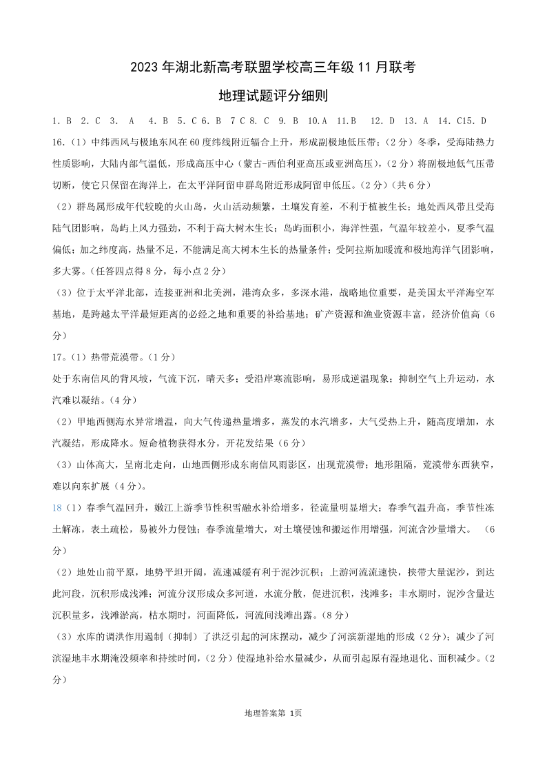 湖北省六校新高考联盟学校2023-2024学年高三上学期11月联考 地理答案