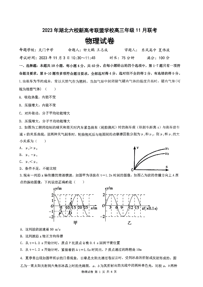湖北省六校新高考联盟学校2023-2024学年高三上学期11月联考 物理