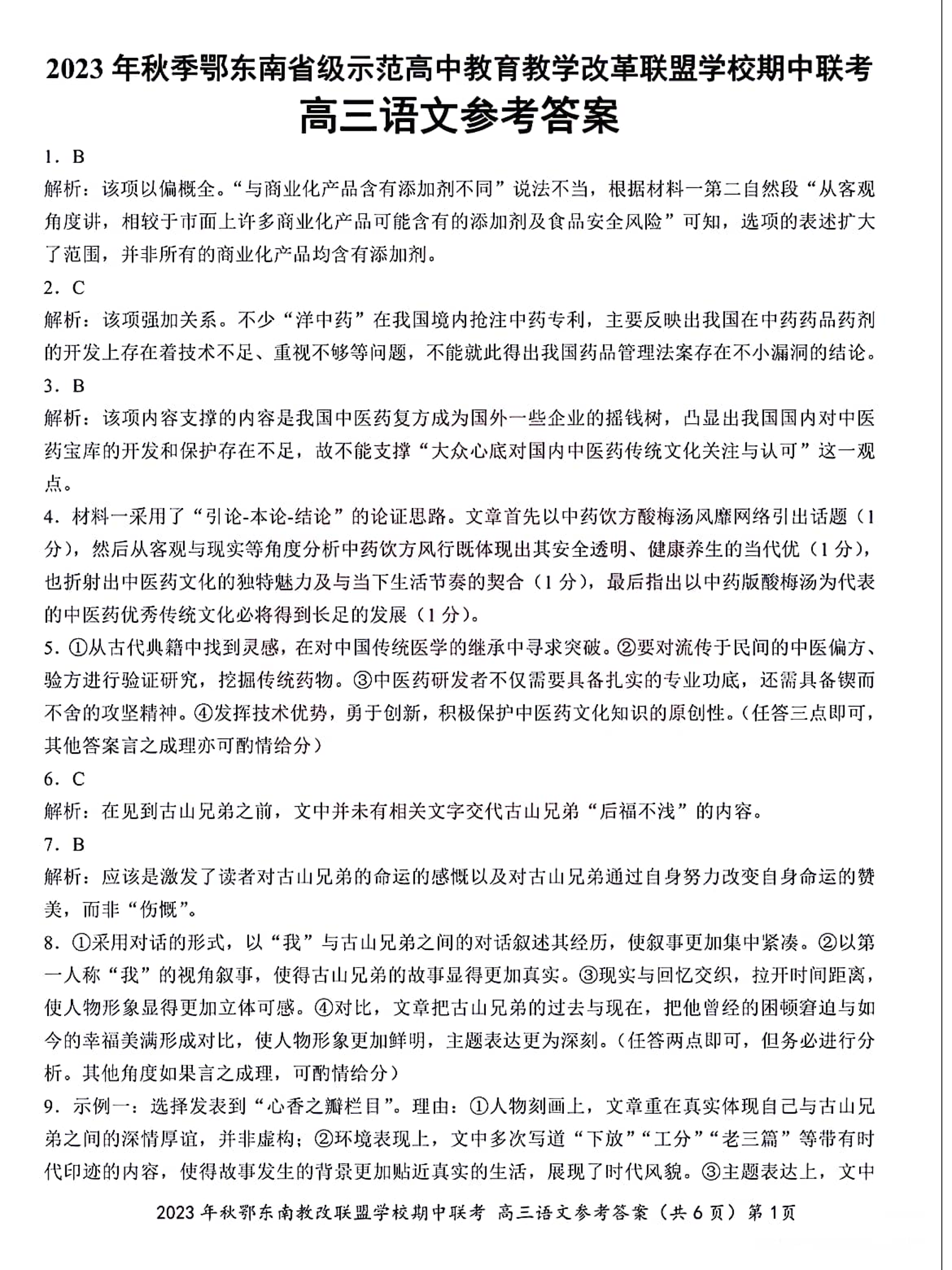 湖北省鄂东南省级示范高中教育教学改革联盟学校2023-2024学年高三上学期期中联考 语文参考答案