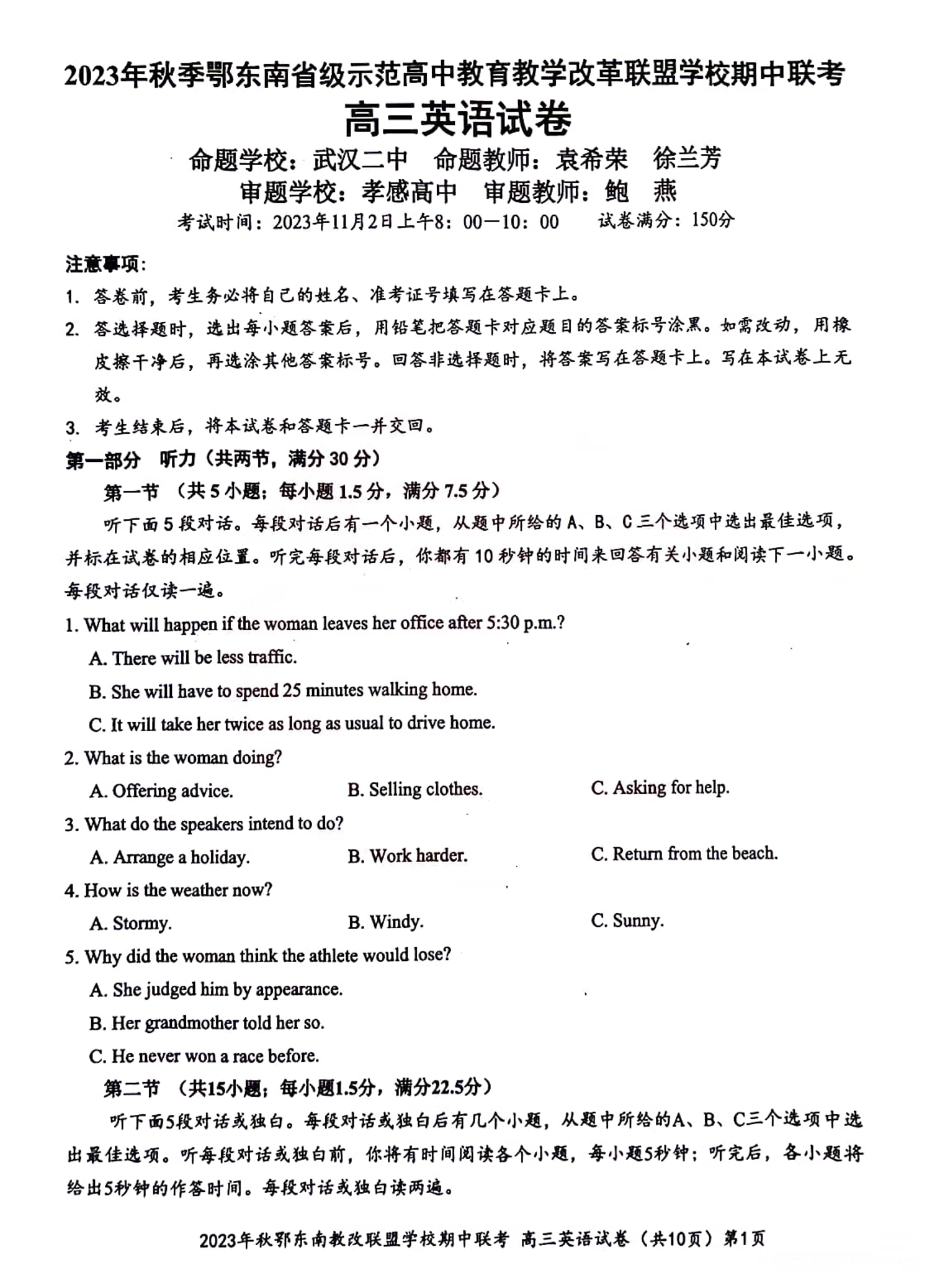 湖北省鄂东南省级示范高中教育教学改革联盟学校2023-2024学年高三上学期期中联考 英语