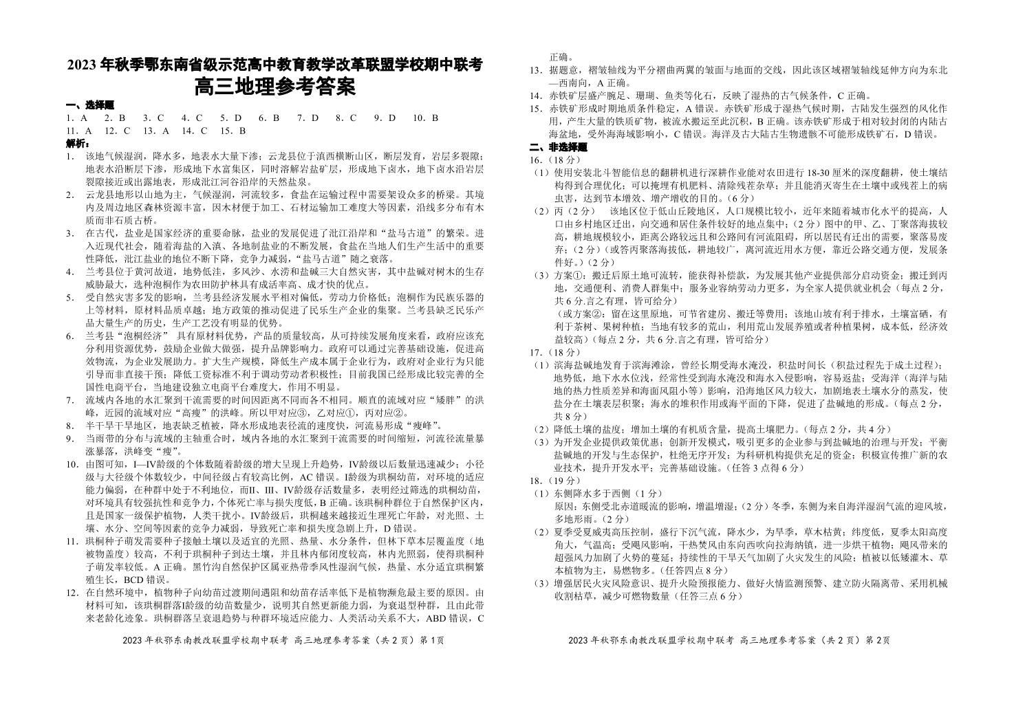 湖北省鄂东南省级示范高中教育教学改革联盟学校2023-2024学年高三上学期期中联考 地理参考答案
