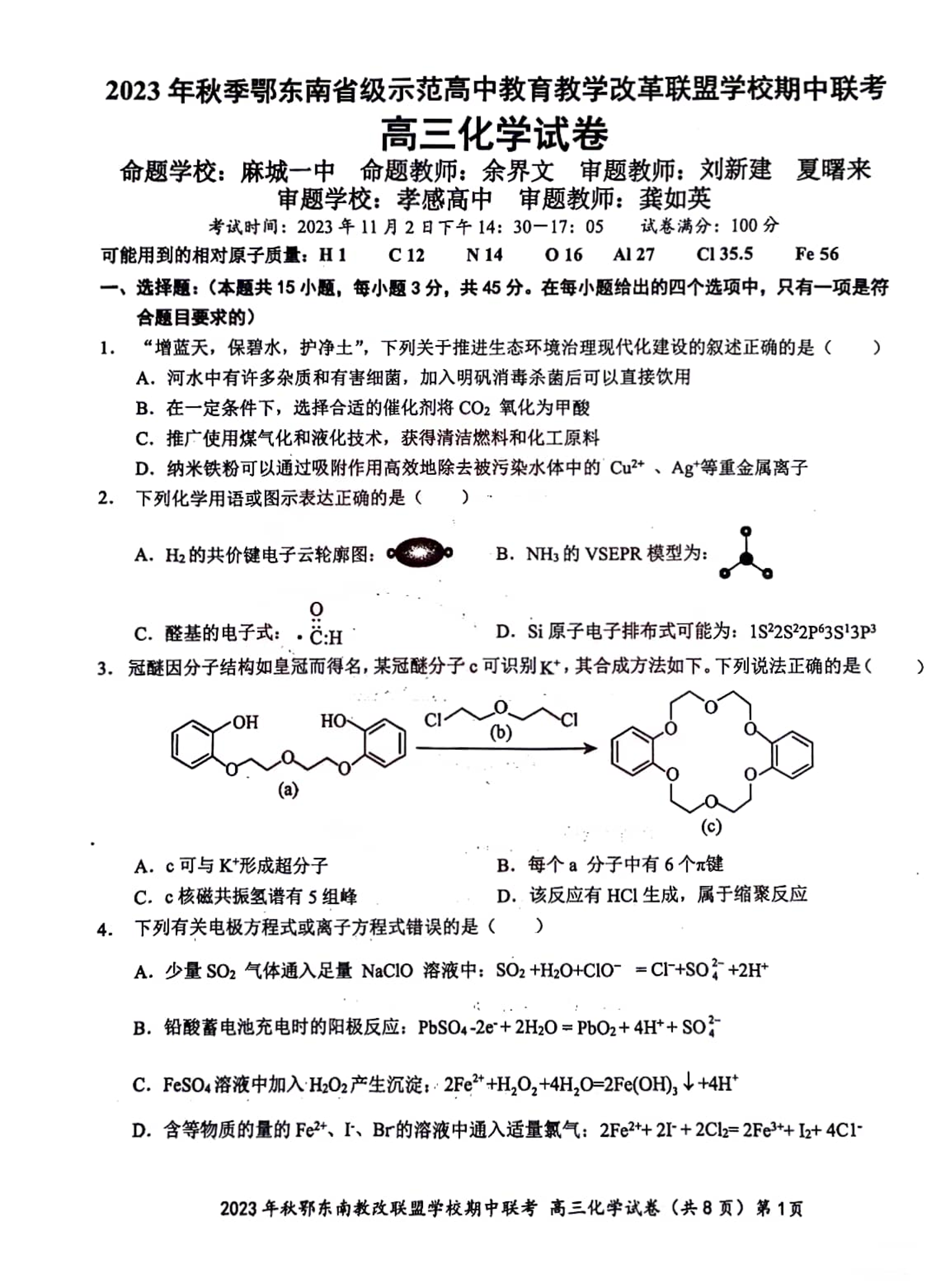 湖北省鄂东南省级示范高中教育教学改革联盟学校2023-2024学年高三上学期期中联考 化学