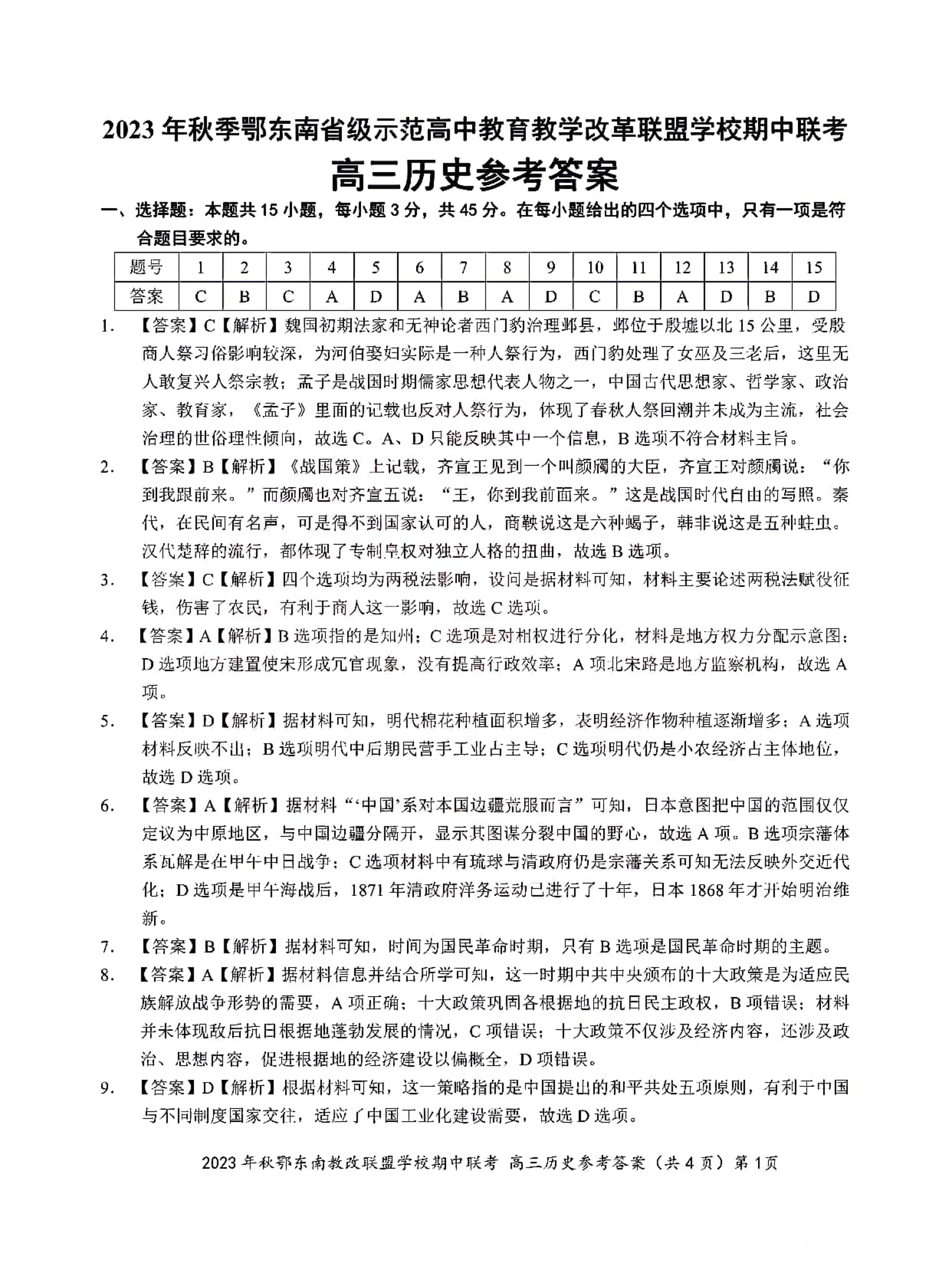湖北省鄂东南省级示范高中教育教学改革联盟学校2023-2024学年高三上学期期中联考 历史参考答案