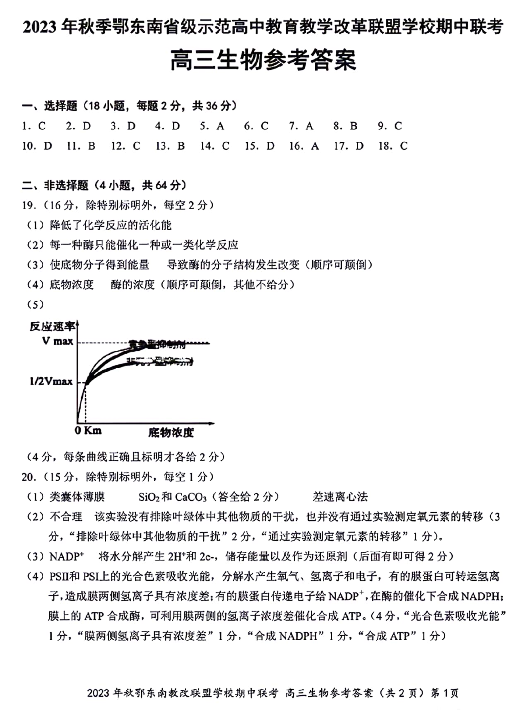 湖北省鄂东南省级示范高中教育教学改革联盟学校2023-2024学年高三上学期期中联考 生物参考答案
