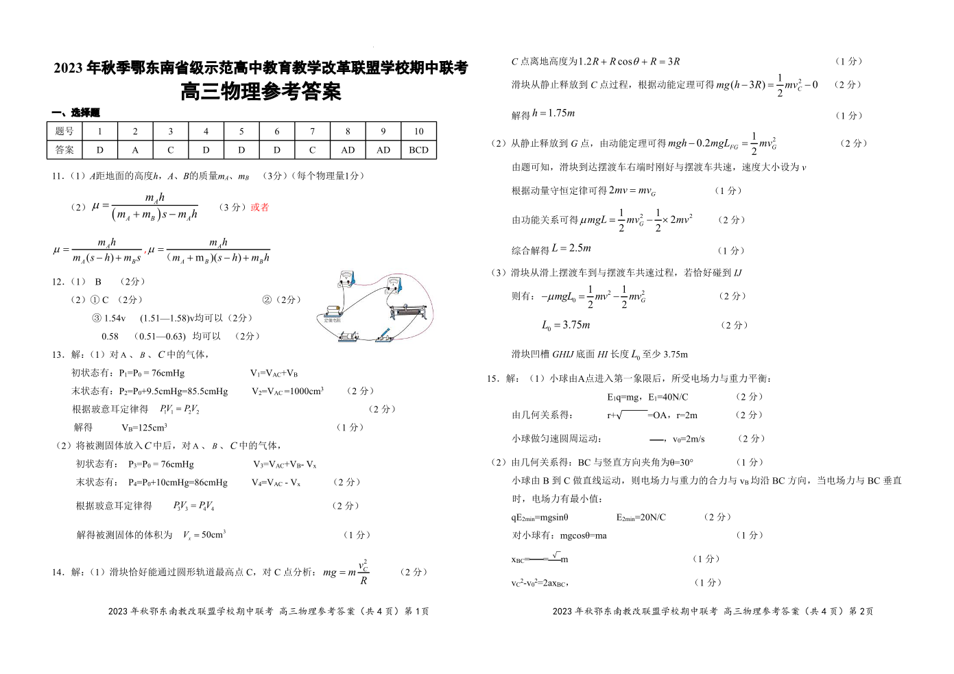湖北省鄂东南省级示范高中教育教学改革联盟学校2023-2024学年高三上学期期中联考 物理参考答案