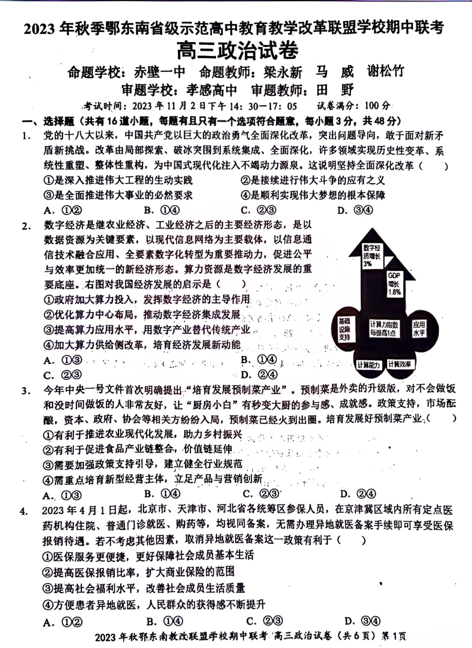 湖北省鄂东南省级示范高中教育教学改革联盟学校2023-2024学年高三上学期期中联考 政治