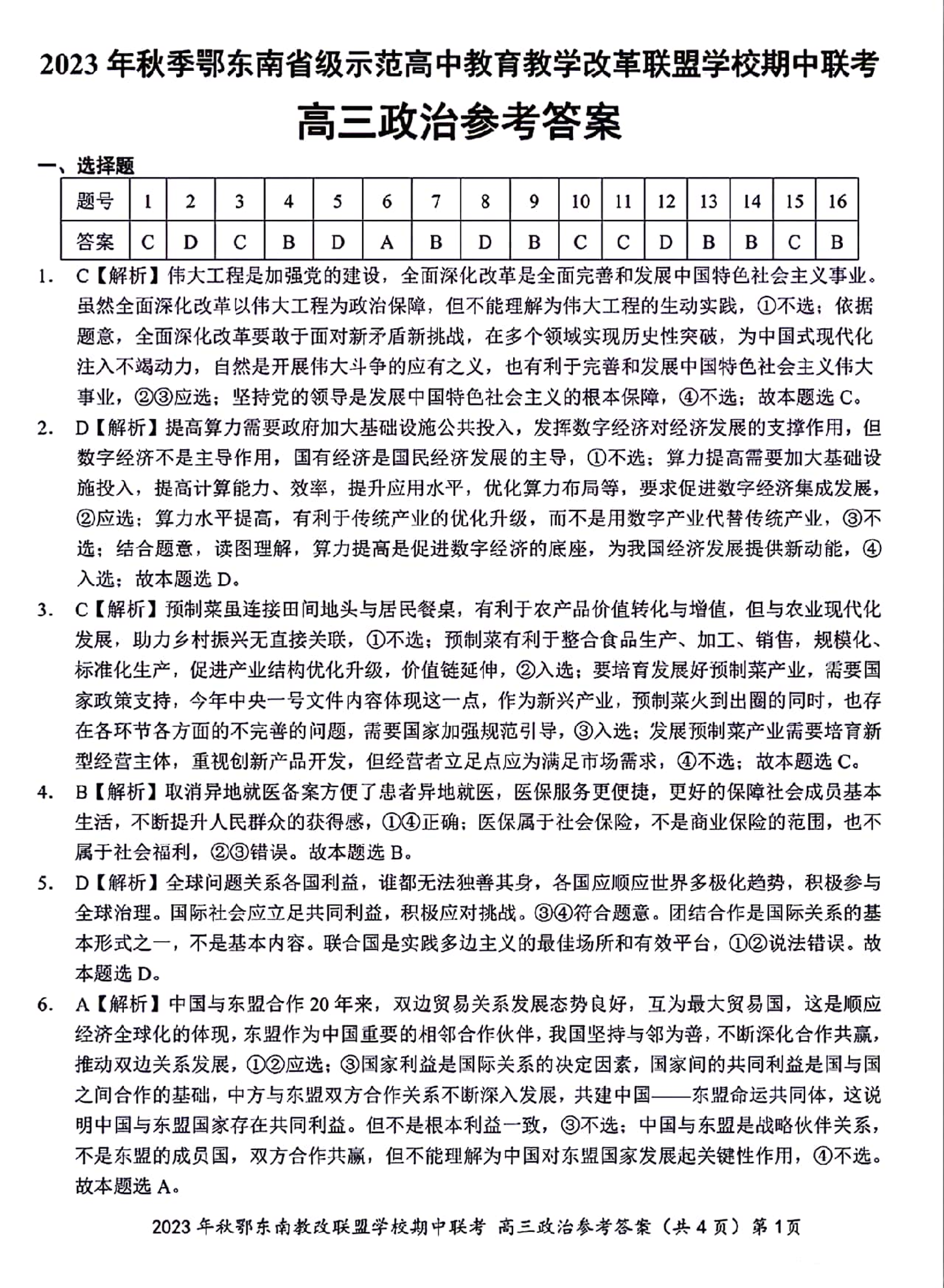 湖北省鄂东南省级示范高中教育教学改革联盟学校2023-2024学年高三上学期期中联考 政治参考答案