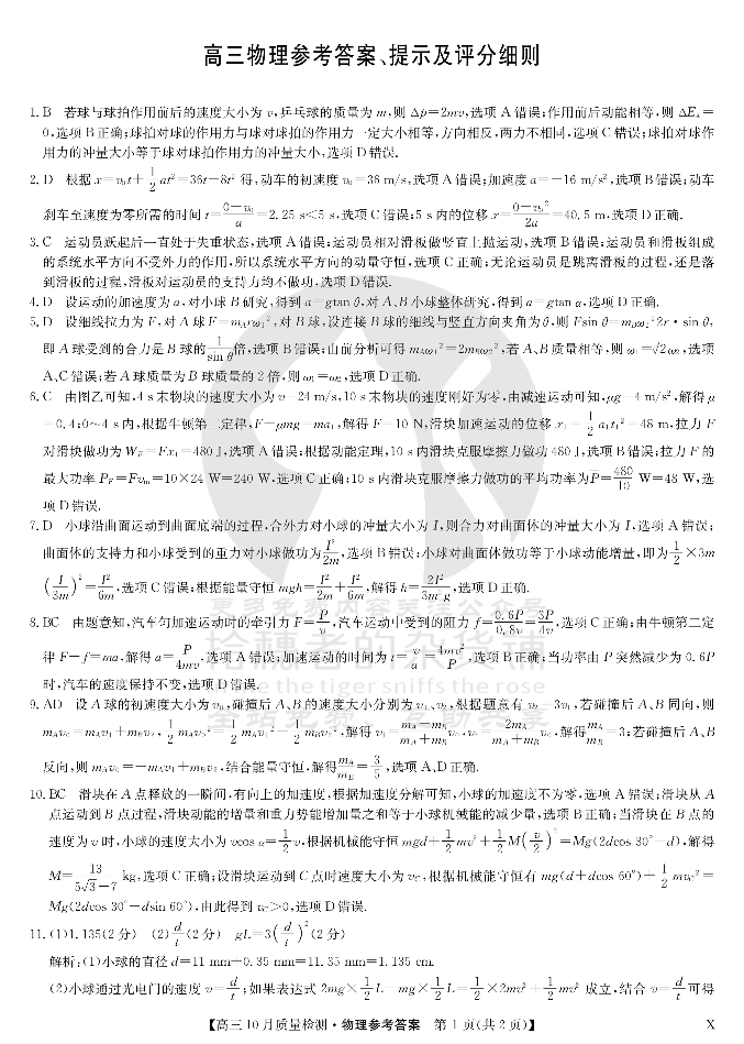 湖北省九师联盟2024届高三10月质量检测 物理答案