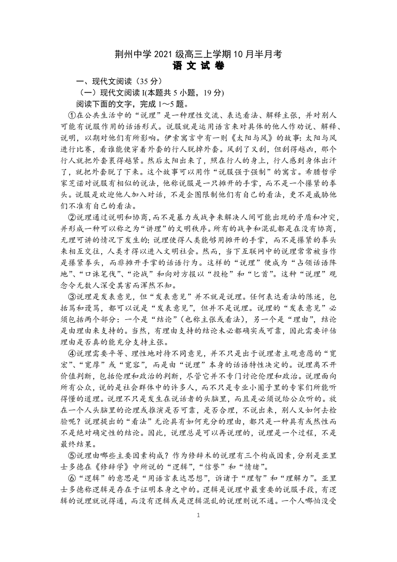 湖北省荆州中学2023-2024学年高三上学期10月半月考 语文