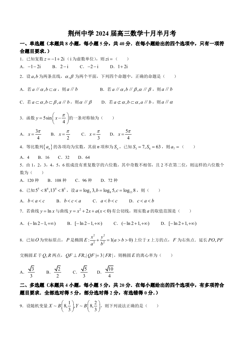 湖北省荆州中学2023-2024学年高三上学期10月半月考 数学