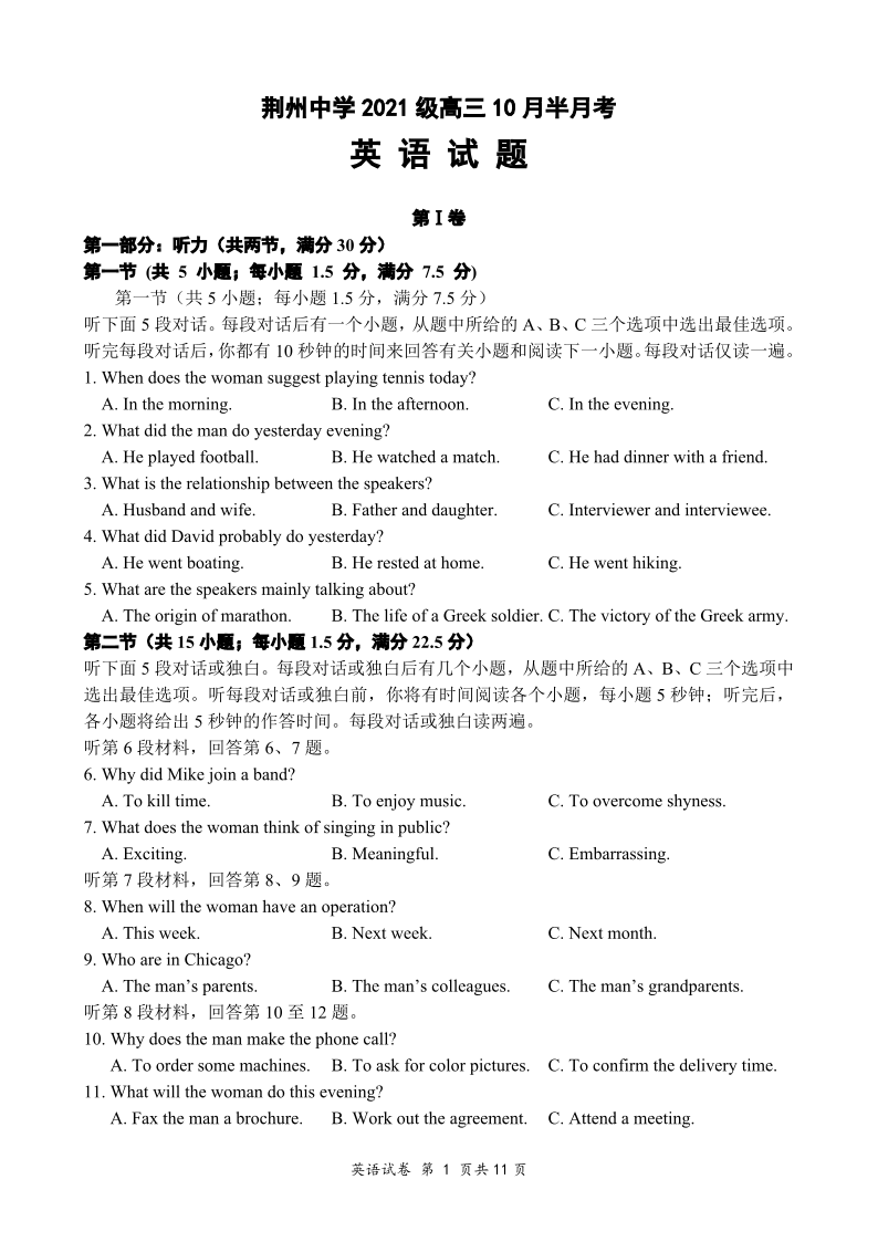 湖北省荆州中学2023-2024学年高三上学期10月半月考 英语
