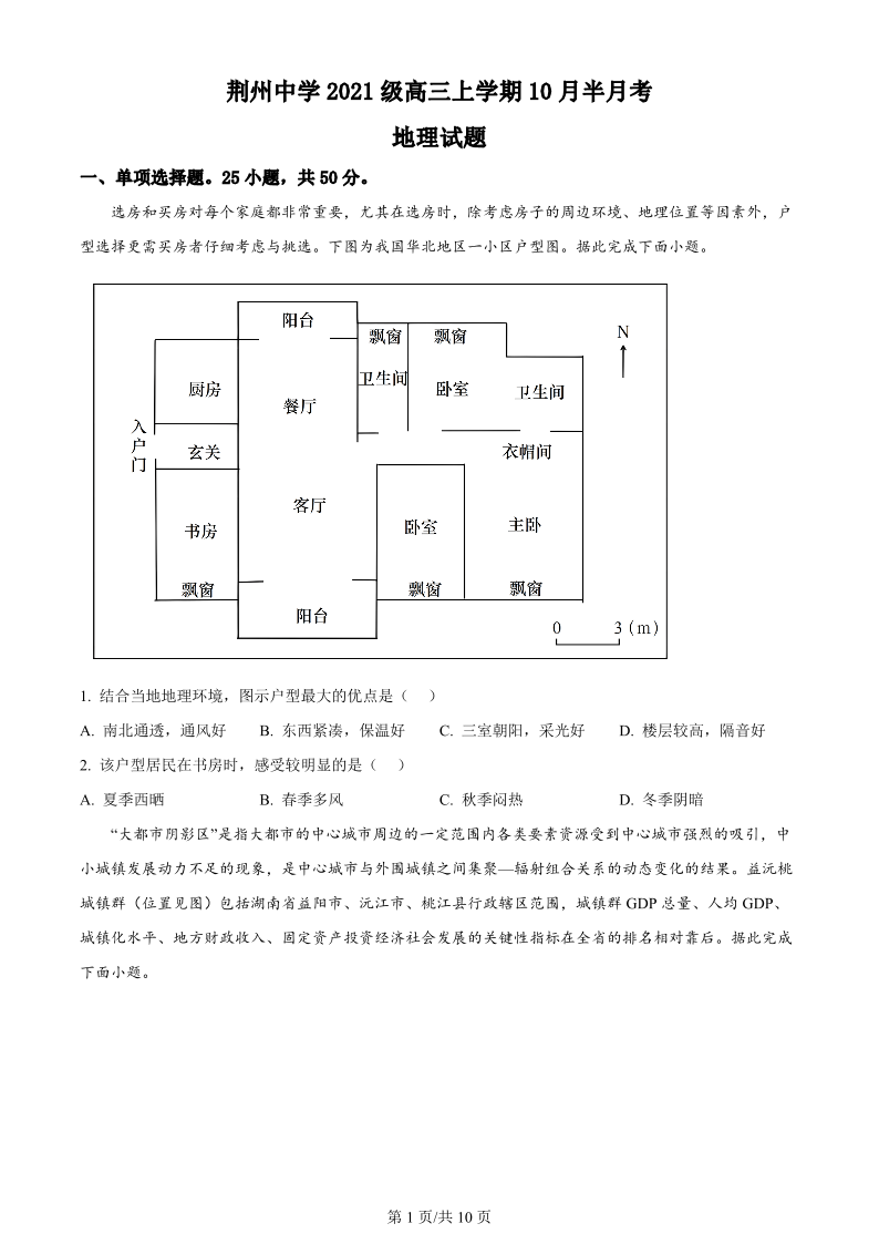 湖北省荆州中学2023-2024学年高三上学期10月半月考 地理