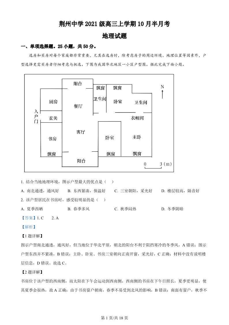 湖北省荆州中学2023-2024学年高三上学期10月半月考 地理答案