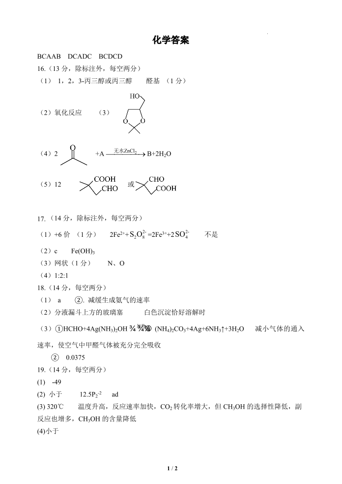 湖北省荆州中学2023-2024学年高三上学期10月半月考 化学答案
