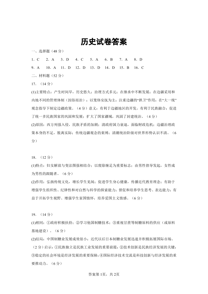 湖北省荆州中学2023-2024学年高三上学期10月半月考 历史答案