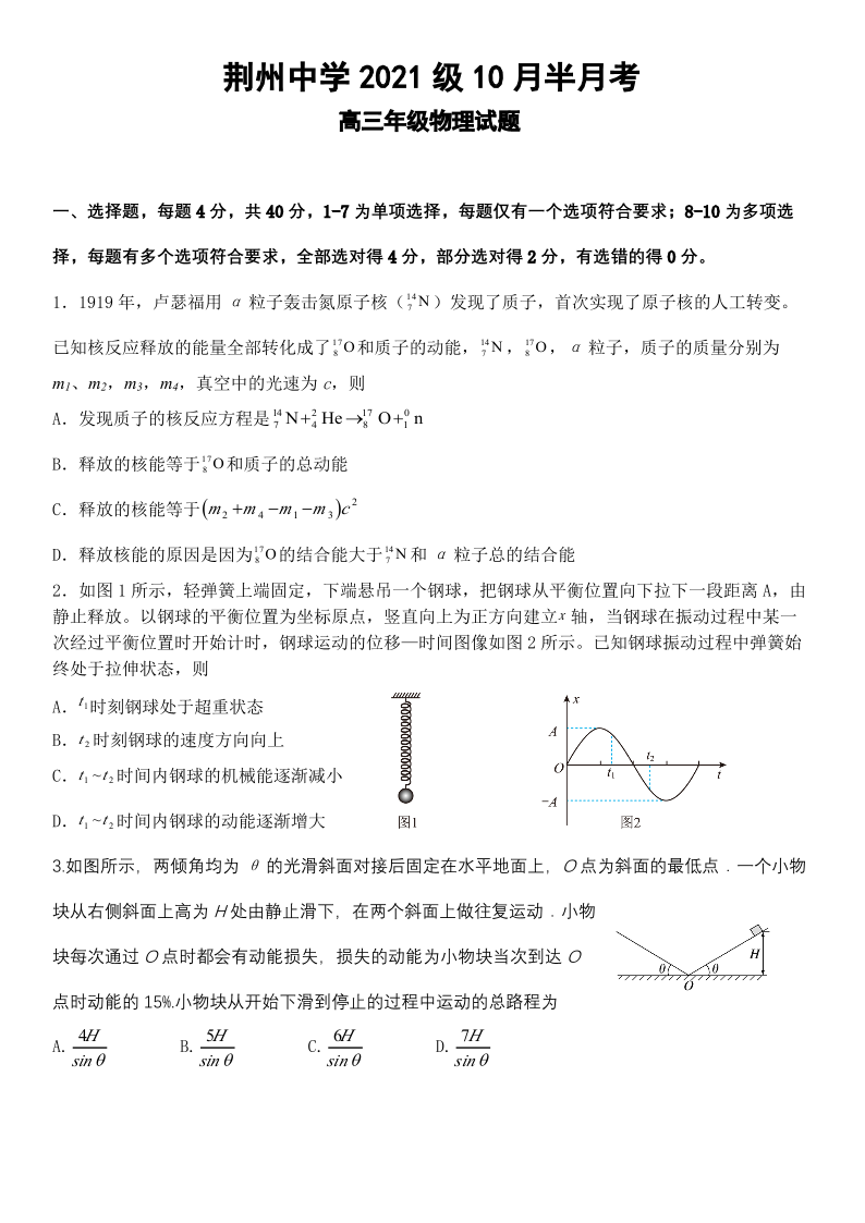 湖北省荆州中学2023-2024学年高三上学期10月半月考 物理