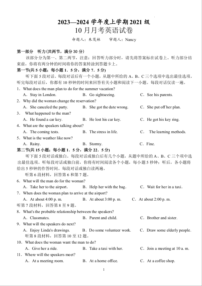 湖北省荆州市沙市中学2023-2024学年高三上学期10月月考 英语