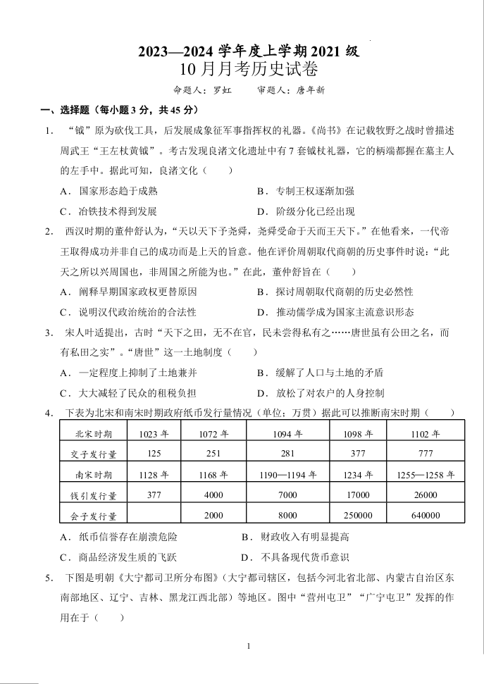 湖北省荆州市沙市中学2023-2024学年高三上学期10月月考 历史