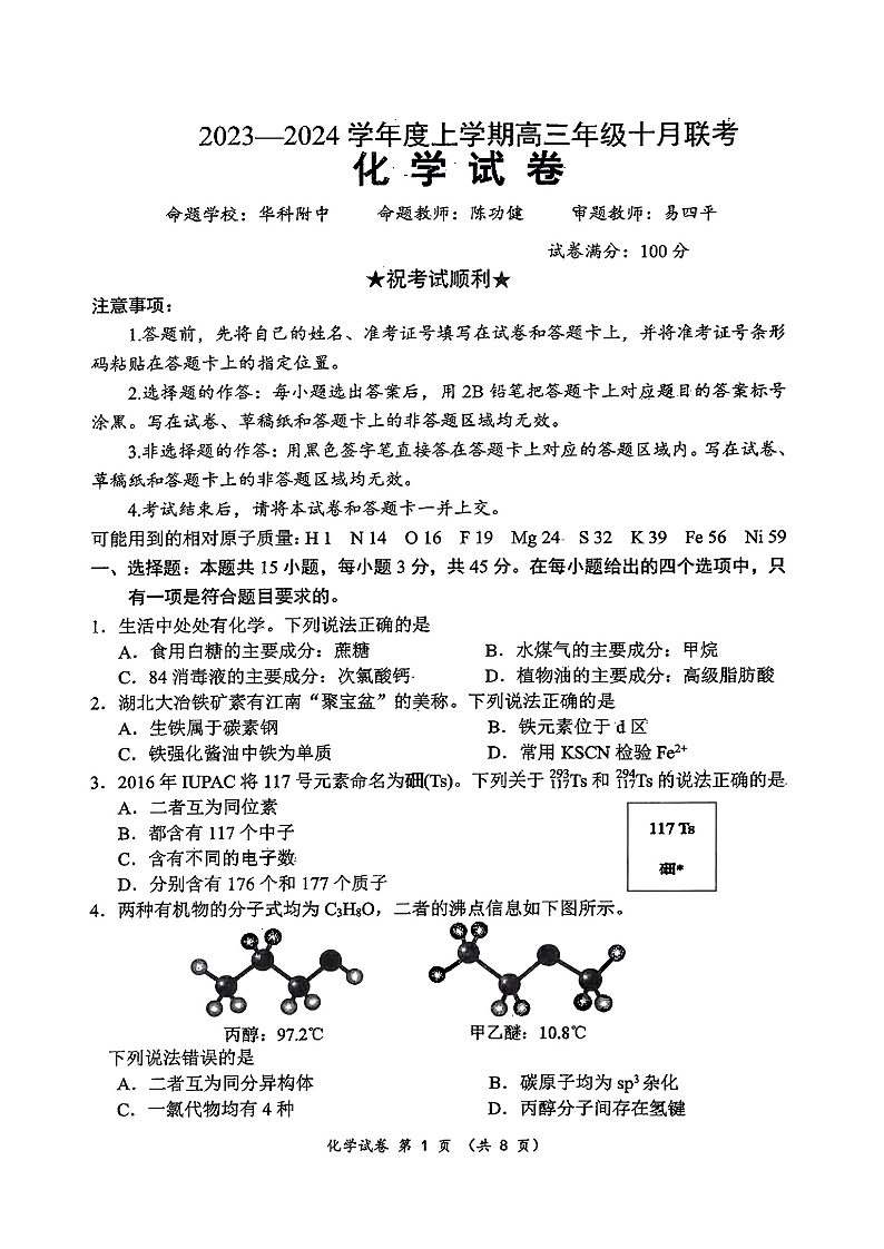 腾云联盟2023-2024学年度上学期高三年级十月联考 化学