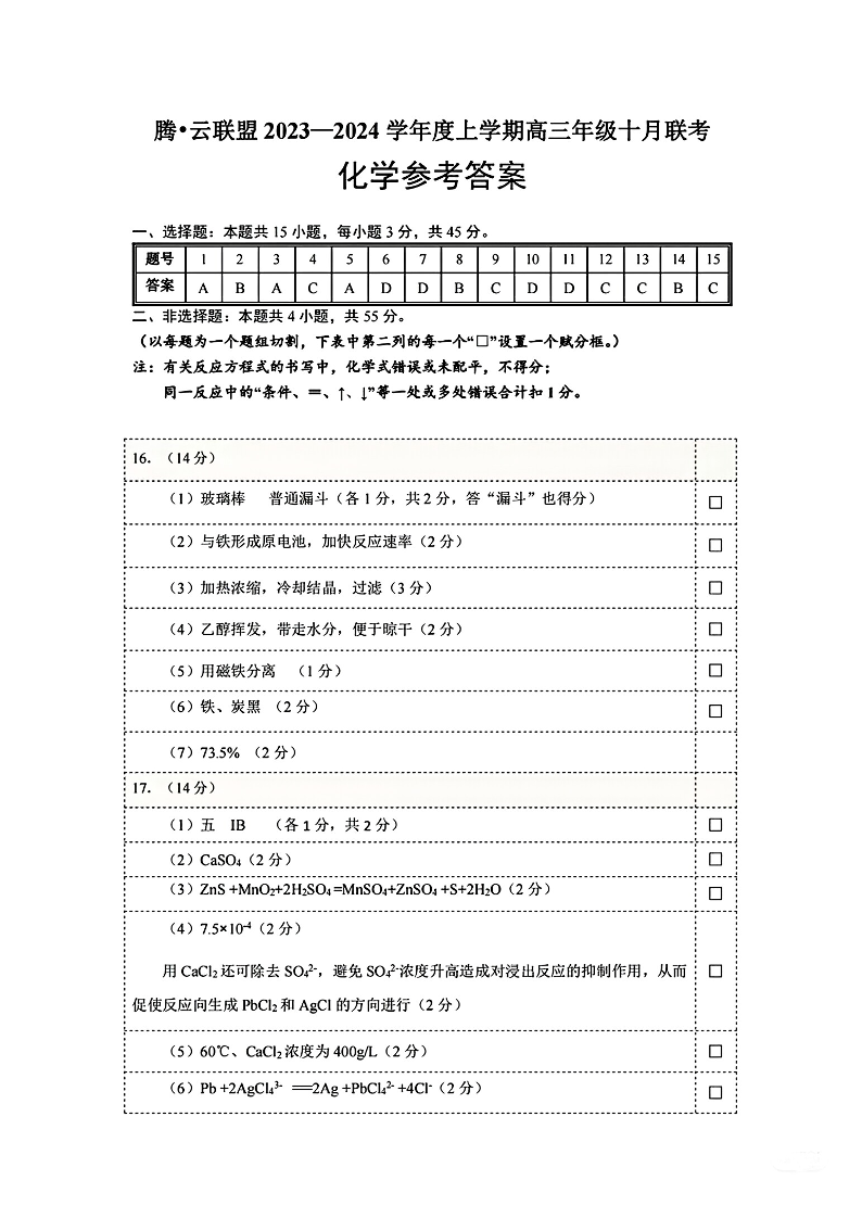 腾云联盟2023-2024学年度上学期高三年级十月联考 化学答案