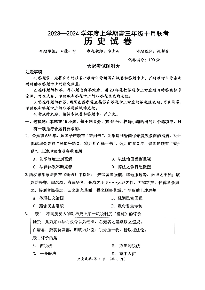 腾云联盟2023-2024学年度上学期高三年级十月联考 历史