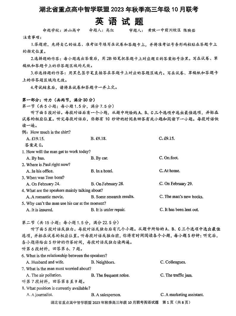 湖北省重点高中智学联盟2023-2024学年高三上学期10月联考 英语