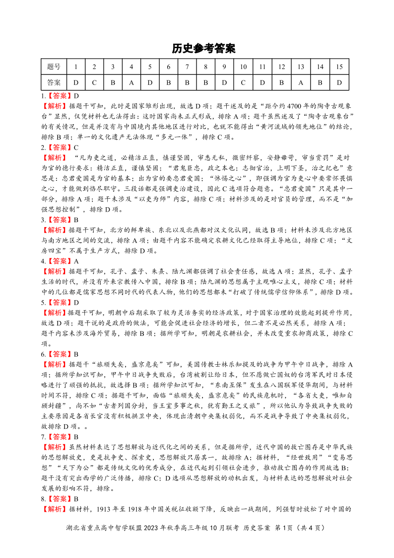 湖北省重点高中智学联盟2023-2024学年高三上学期10月联考 历史答案